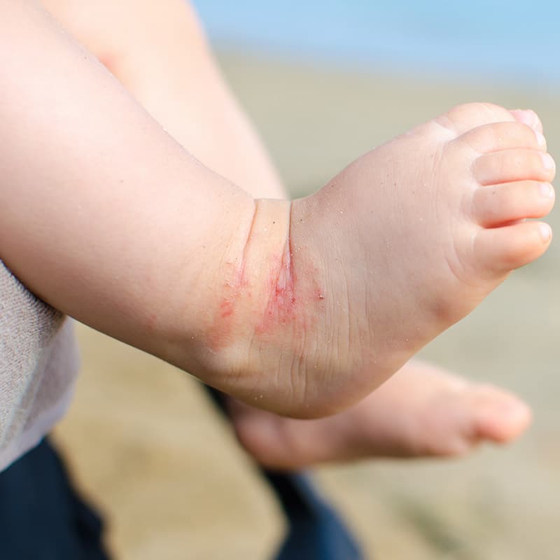 Cette maladie de la peau se manifeste par des zones rouges, qui démangent fortement et présentent des pustules ou des croûtes. Chez les nourrissons, elle touche le plus souvent le visage et la partie extérieure des membres, chez les enfants plus grands et chez les adultes, la névrodermite se manifeste principalement dans le cou, au niveau des articulations et des mains. Contrairement à d’autres maladies de la peau présentant des symptômes similaires, la névrodermite évolue par poussées et se manifeste souvent dès le plus jeune âge. Différents signes caractéristiques, tels qu’un pli double de la paupière inférieure, indiquent une prédisposition à la névrodermite.